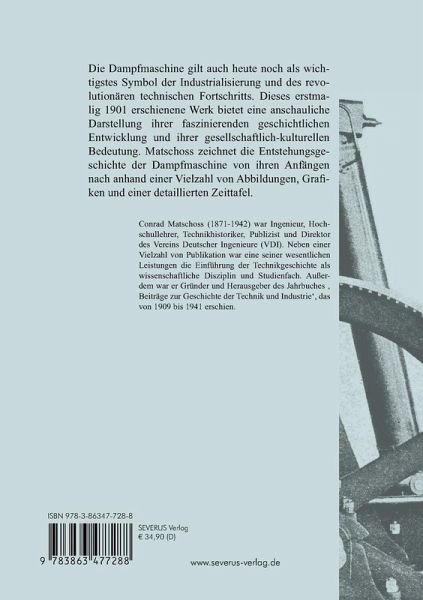 Die Dampfmaschine gilt auch heute noch als wichtigstes Symbol der Industrialisierung und des revolutionären technischen Fortschritts. Dieses erstmalig 1901 erschienene Werk bietet eine anschauliche Darstellung ihrer faszinierenden geschichtlichen Entwicklung und ihrer gesellschaftlich-kulturellen Bedeutung. Matschoss zeichnet die Entstehungsgeschichte der Dampfmaschine von ihren Anfängen nach anhand einer Vielzahl von Abbildungen, Grafiken und einer detaillierten Zeittafel.Conrad Matschoss (1871-1942) war Ingenieur, Hochschullehrer, Technikhistoriker, Publizist und Direktor des Vereins Deutscher Ingenieure (VDI). Neben einer Vielzahl von Publikation war eine seiner wesentlichen Leistungen die Einführung der Technikgeschichte als wissenschaftliche Disziplin und Studienfach. Außerdem war er Gründer und Herausgeber des Jahrbuches 'Beiträge zur Geschichte der Technik und Industrie', das von 1909 bis 1941 erschien.