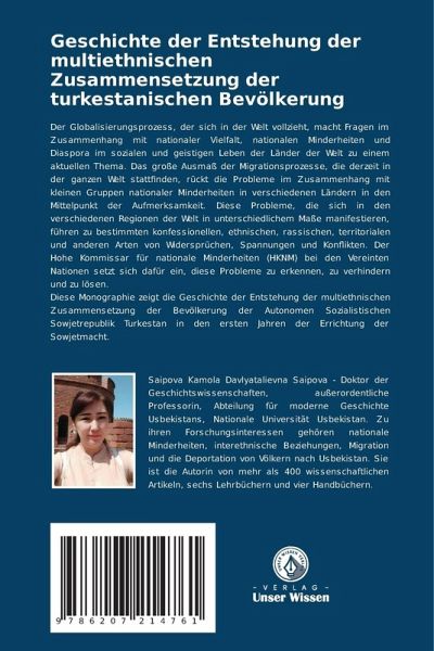 Der Globalisierungsprozess, der sich in der Welt vollzieht, macht Fragen im Zusammenhang mit nationaler Vielfalt, nationalen Minderheiten und Diaspora im sozialen und geistigen Leben der Länder der Welt zu einem aktuellen Thema. Das große Ausmaß der Migrationsprozesse, die derzeit in der ganzen Welt stattfinden, rückt die Probleme im Zusammenhang mit kleinen Gruppen nationaler Minderheiten in verschiedenen Ländern in den Mittelpunkt der Aufmerksamkeit. Diese Probleme, die sich in den verschiedenen Regionen der Welt in unterschiedlichem Maße manifestieren, führen zu bestimmten konfessionellen, ethnischen, rassischen, territorialen und anderen Arten von Widersprüchen, Spannungen und Konflikten. Der Hohe Kommissar für nationale Minderheiten (HKNM) bei den Vereinten Nationen setzt sich dafür ein, diese Probleme zu erkennen, zu verhindern und zu lösen.Diese Monographie zeigt die Geschichte der Entstehung der multiethnischen Zusammensetzung der Bevölkerung der Autonomen SozialistischenSowjetrepublik Turkestan in den ersten Jahren der Errichtung der Sowjetmacht.