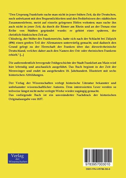 "Den Ursprung Frankfurts suche man nicht in jener frühen Zeit, da die Deutschen, noch unbekannt mit den Bequemlichkeiten und den Bedürfnissen des städtischen Zusammenlebens, meist auf einzeln gelegenen Höfen wohnten; man suche ihn auch nicht in jener Zeit, da durch die Römer am Rhein und an der Donau eine Reihe von Städten gegründet wurde; er gehört einer späteren, der christlich-fränkischen Zeit an.
