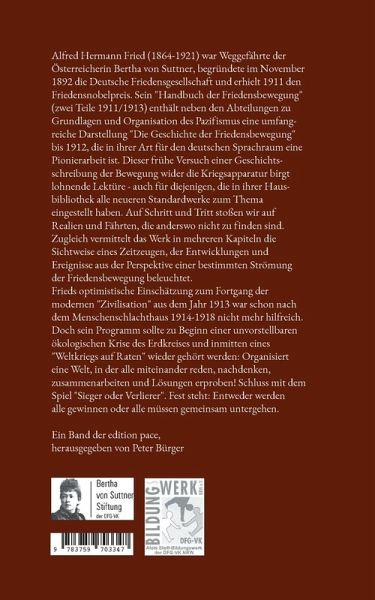 Alfred Hermann Fried (1864-1921) war Weggefährte der Österreicherin Bertha von Suttner, begründete im November 1892 die Deutsche Friedensgesellschaft und erhielt 1911 den Friedensnobelpreis. Sein "Handbuch der Friedensbewegung" (zwei Teile 1911/1913) enthält neben den Abteilungen zu Grundlagen und Organisation des Pazifismus eine umfangreiche Darstellung "Die Geschichte der Friedensbewegung" bis 1912, die in ihrer Art für den deutschen Sprachraum eine Pionierarbeit ist. Dieser frühe Versuch einer Geschichtsschreibung der Bewegung wider die Kriegsapparatur birgt lohnende Lektüre - auch für diejenigen, die in ihrer Hausbibliothek alle neueren Standardwerke zum Thema eingestellt haben. Auf Schritt und Tritt stoßen wir auf Realien und Fährten, die anderswo nicht zu finden sind. Zugleich vermittelt das Werk in mehreren Kapiteln die Sichtweise eines Zeitzeugen, der Entwicklungen und Ereignisse aus der Perspektive einer bestimmten Strömung der Friedensbewegung beleuchtet.Frieds optimistische Einschätzung zum Fortgang der modernen "Zivilisation" aus dem Jahr 1913 war schon nach dem Menschenschlachthaus 1914-1918 nicht mehr hilfreich. Doch sein Programm sollte zu Beginn einer unvorstellbaren ökologischen Krise des Erdkreises und inmitten eines "Weltkriegs auf Raten" wieder gehört werden: Organisiert eine Welt, in der alle miteinander reden, nachdenken, zusammenarbeiten und Lösungen erproben! Schluss mit dem Spiel "Sieger oder Verlierer". Faktum ist: Entweder werden alle gewinnen oder alle müssen gemeinsam untergehen.Ein Band der edition pace,herausgegeben von Peter Bürger