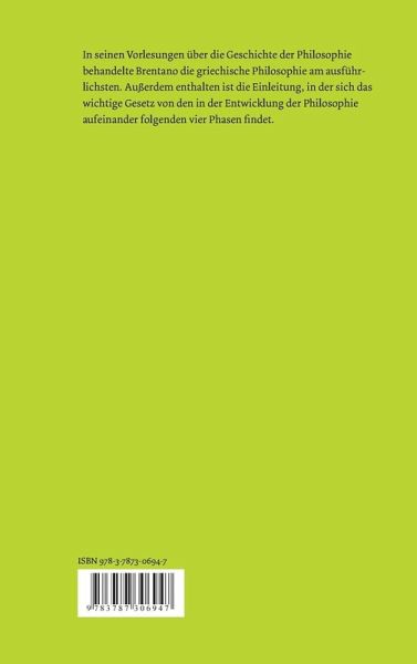 In seinen Vorlesungen über Geschichte der Philosophie behandelte Brentano die griechische Philosophie am ausführlichsten. Außerdem enthalten ist die Einleitung, in der sich das wichtige Gesetz von den in der Entwicklung der Philosophie aufeinander folgenden vier Phasen findet.