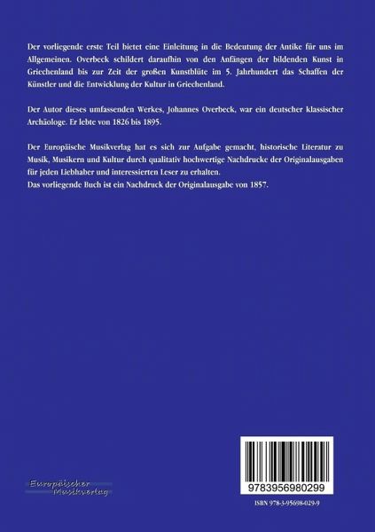 Der vorliegende erste Teil bietet eine Einleitung in die Bedeutung der Antike für uns im Allgemeinen. Overbeck schildert daraufhin von den Anfängen der bildenden Kunst in Griechenland bis zur Zeit der großen Kunstblüte im 5. Jahrhundert das Schaffen der Künstler und die Entwicklung der Kultur in Griechenland.