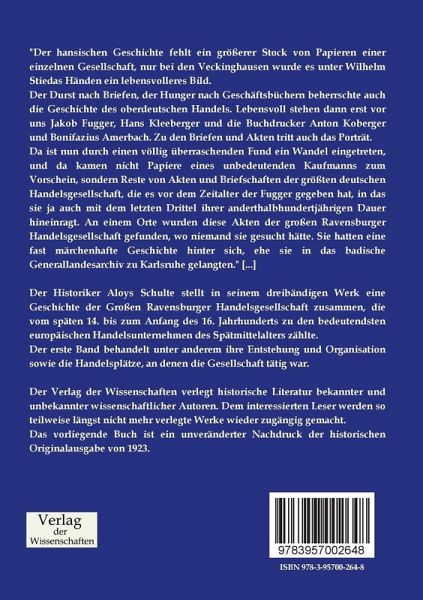Der Historiker Aloys Schulte stellt in seinem dreibändigen Werk eine Geschichte der Großen Ravensburger Handelsgesellschaft zusammen, die vom späten 14. bis zum Anfang des 16. Jahrhunderts zu den bedeutendsten europäischen Handelsunternehmen des Spätmittelalters zählte.