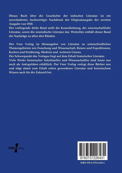 Der vorliegende dritte Band stellt die Kunstdichtung, die wissenschaftliche Literatur, sowie die neuindische Literatur dar. Weiterhin enthält dieser Band die Nachträge zu allen drei Bänden.