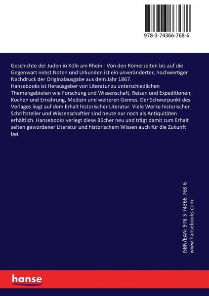 Geschichte der Juden in Köln am Rhein - Von den Römerzeiten bis auf die Gegenwart nebst Noten und Urkunden ist ein unveränderter, hochwertiger Nachdruck der Originalausgabe aus dem Jahr 1867.