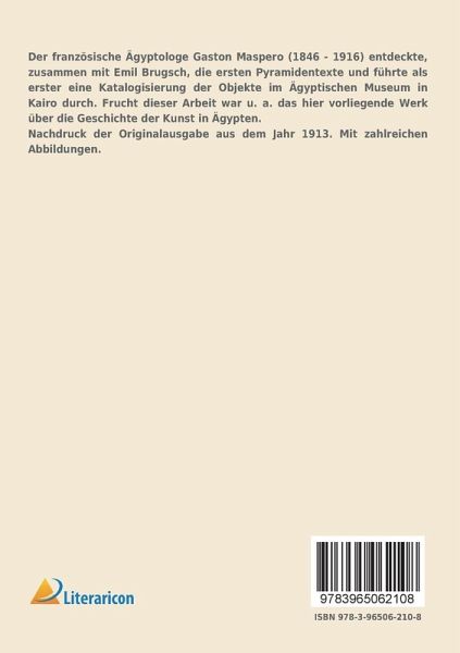 Der französische Ägyptologe Gaston Maspero (1846 - 1916) entdeckte, zusammen mit Emil Brugsch, die ersten Pyramidentexte und führte als erster eine Katalogisierung der Objekte im Ägyptischen Museum in Kairo durch. Frucht dieser Arbeit war u. a. das hier vorliegende Werk über die Geschichte der Kunst in Ägypten.