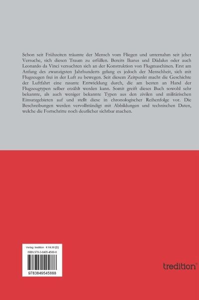 Schon seit Frühzeiten träumte der Mensch vom Fliegen und unternahm seit jeher Versuche, sich diesen Traum zu erfüllen. Bereits Ikarus und Dädalus oder auch Leonardo da Vinci versuchten sich an der Konstruktion von Flugmaschinen. Erst am Anfang des zwanzigsten Jahrhunderts gelang es jedoch der Menschheit, sich mit Flugzeugen frei in der Luft zu bewegen. Seit diesem Zeitpunkt macht die Geschichte der Luftfahrt eine rasante Entwicklung durch, die am besten an Hand der Flugzeugtypen selber erzählt werden kann. Somit greift dieses Buch sowohl sehr bekannte, als auch weniger bekannte Typen aus den zivilen und militärischen Einsatzgebieten auf und stellt diese in chronologischer Reihenfolge vor. Die Beschreibungen werden vervollständigt mit Abbildungen und technischen Daten, welche die Fortschritte noch deutlicher sichtbar machen.