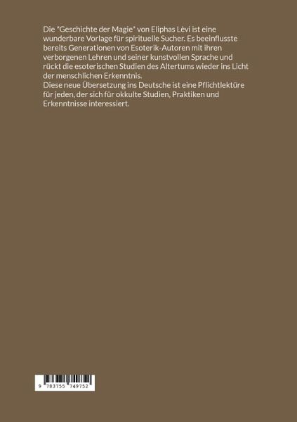 Die "Geschichte der Magie" von Eliphas Lèvi ist eine wunderbare Vorlage für spirituelle Sucher. Es beeinflusste bereits Generationen von Esoterik-Autoren mit ihren verborgenen Lehren und seiner kunstvollen Sprache und rückt die esoterischen Studien des Altertums wieder ins Licht der menschlichen Erkenntnis. Diese neue Übersetzung ins Deutsche ist eine Pflichtlektüre für jeden, der sich für okkulte Studien, Praktiken und Erkenntnisse interessiert.