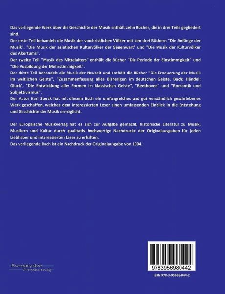 Der Autor Karl Storck hat mit diesem Buch ein umfangreiches und gut verständlich geschriebenes Werk geschaffen, welches dem interessierten Leser einen umfassenden Einblick in die Entstehung und Geschichte der Musik ermöglicht.