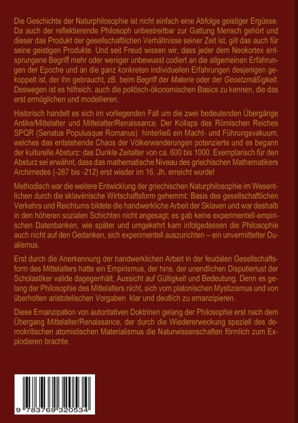 Die Geschichte der Naturphilosophie ist nicht einfach eine Abfolge geistiger Ergüsse. Da auch der reflektierende Philosoph unbestreitbar zur Gattung Mensch gehört und dieser das Produkt der gesellschaftlichen Verhältnisse seiner Zeit ist, gilt das auch für seine geistigen Produkte. Und seit Freud wissen wir, dass jeder dem Neokortex entspringende Begriff mehr oder weniger unbewusst codiert an die allgemeinen Erfahrungen der Epoche und an die ganz konkreten individuellen Erfahrungen desjenigen gekoppelt ist, der ihn gebraucht, zB. beim Begriff der Materie oder der Gesetzmäßigkeit. Deswegen ist es hilfreich, auch die politisch-ökonomischen Basics, die das ermöglichen und beeinflussen, zu kennen. Historisch handelt es sich im vorliegenden Fall um die zwei bedeutenden Übergänge Antike/Mittelalter und Mittelalter/Renaissance. Der Kollaps des Römischen Reiches SPQR (Senatus Populusque Romanus) hinterließ ein Macht- und Führungsvakuum, welches das entstehende Chaos der Völkerwanderungen potenzierte und es begann der kulturelle Absturz: das Dunkle Zeitalter von 600 bis 1000. Exemplarisch für den Absturz sei erwähnt, dass das mathematische Niveau des griechischen Mathematikers Archimedes (-287 bis -212) erst wieder im 16. Jh. erreicht wurde! Methodisch war die weitere Entwicklung der griechischen Naturphilosophie im Wesentlichen durch die Sklavenhalter- Wirtschaftsform gehemmt: der gesellschaftliche Reichtum wurde durch die handwerkliche Arbeit der Sklaven erzeugt und war in den höheren sozialen Schichten verpönt; dadurch kamen auch die Philosophen nicht auf den Gedanken einer experimentellen Forschung und umgekehrt wurden der Philosophie keine praktischen Aufgaben gestellt - ein unvermittelter Dualismus. Erst durch die Anerkennung der handwerklichen Arbeit in der feudalen Gesellschaftsform des Mittelalters hatte ein Empirismus, der hins. der unendlichen Disputierlust der Scholastiker valide dagegenhält, Aussicht auf Vollständigkeit und Integration. Denn es gelang der Philosophie des Mittelalters nicht, sich vom platonischen Mystizismus und von überholten aristotelischen Vorgaben klar und deutlich zu emanzipieren. Diese Emanzipation von autoritativen Doktrinen gelang der Philosophie erst nach dem Übergang Mittelalter/Renaissance, der durch die Renaissance speziell des demokritischen Materialismus die Naturwissenschaften förmlich zum Explodieren brachte.