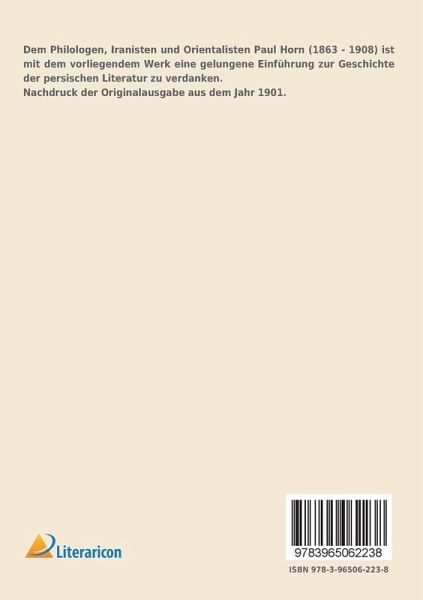 Dem Philologen, Iranisten und Orientalisten Paul Horn (1863 - 1908) ist mit dem vorliegendem Werk eine gelungene Einführung zur Geschichte der persischen Literatur zu verdanken.