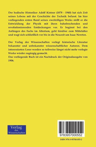 Der badische Historiker Adolf Kistner (1878 - 1940) hat sich Zeit seines Lebens mit der Geschichte der Technik befasst. Im hier vorliegenden ersten Band seines zweiteiligen Werks stellt er die Entwicklung der Physik mit ihren bahnbrechenden und revolutionierenden Entdeckungen vor. Er beginnt bei den Anfängen des Fachs im Altertum, geht hinüber zum Mittelalter und wagt sich schließlich vor bis in die Neuzeit um Isaac Newton.