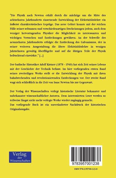 "Die Physik nach Newton erhält durch die mächtige um die Mitte des achtzehnten Jahrhunderts einsetzende Entwicklung der Elektrizitätslehre ein äußerst charakteristisches Gepräge. Das neue Gebiet konnte mit der reichen Fülle seiner seltsamen und verschiedenartigen Erscheinungen jedem, auch dem weniger hervorragenden Physiker die Möglichkeit zu interessanten und wichtigen Versuchen und Entdeckungen gewähren. An der Schwelle des neunzehnten Jahrhunderts erfolgte die Entdeckung des Galvanismus, der in seiner weiteren Ausgestaltung die ältere Elektrizitätslehre in wenigen Jahrzehnten gewaltig überflügelte und auf die übrigen Teile der Physik befruchtend einwirkte." [...]