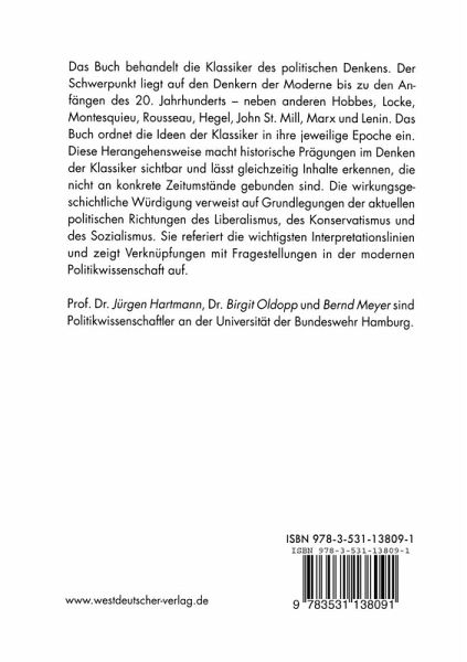Das Buch behandelt die Klassiker des politischen Denkens. Der Schwerpunkt liegt auf den Denkern der Moderne bis zu den Anfängen des 20. Jahrhunderts - neben anderen Hobbes, Locke, Montesquieu, Rousseau, Hegel, John St. Mill, Marx und Lenin. Das Buch ordnet die Ideen der Klassiker in ihre jeweilige Epoche ein. Diese Herangehensweise macht historische Prägungen im Denken der Klassiker sichtbar und lässt gleichzeitig Inhalte erkennen, die nicht an konkrete Zeitumstände gebunden sind. Die wirkungsgeschichtliche Würdigung verweist auf Grundlegungen der aktuellen politischen Richtungen des Liberalismus, des Konservatismus und des Sozialismus. Sie referiert die wichtigsten Interpretationslinien und zeigt Verknüpfungen mit Fragestellungen in der modernen Politikwissenschaft auf.