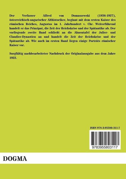 Der Verfasser Alfred von Domaszewski (1856-1927), österreichisch-ungarischer Althistoriker, beginnt mit dem ersten Kaiser des römischen Reiches, Augustus im 1. Jahrhundert v. Chr. Weiterführend handelt er das Prinzipat, die Zeit der Reichskrise und der Spätantike ab. Der vorliegende zweite Band schließt an die Ahnentafel der Julier- und Claudier-Dynastien an und handelt die Zeit der Reichskrise und der Spätantike ab. Wie auch im ersten Band liegen einige Porträts römischer Kaiser vor.