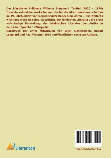 Der klassische Philologe Wilhelm Siegmund Teuffel (1820 - 1878) "brachte zahlreiche Werke hervor, die für die Altertumswissenschaften im 19. Jahrhundert von wegweisender Bedeutung waren ... Ein weiteres wichtiges Werk ist seine 'Geschichte der römischen Literatur', die erste vollständige Darstellung der lateinischen Literatur der Antike in deutscher Sprache." (Wikipedia) Nachdruck der unter Mitwirkung von Erich Klostermann, Rudolf Leonhard und Paul Wessner 1910 veröffentlichten sechsten Auflage.
