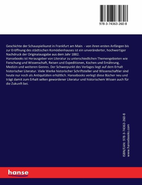 Geschichte der Schauspielkunst in Frankfurt am Main - von ihren ersten Anfängen bis zur Eröffnung des städtischen Komödienhauses ist ein unveränderter, hochwertiger Nachdruck der Originalausgabe aus dem Jahr 1882.