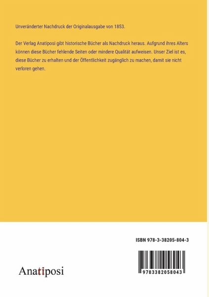 Unveränderter Nachdruck der Originalausgabe von 1853. Der Verlag Anatiposi gibt historische Bücher als Nachdruck heraus. Aufgrund ihres Alters können diese Bücher fehlende Seiten oder mindere Qualität aufweisen. Unser Ziel ist es, diese Bücher zu erhalten und der Öffentlichkeit zugänglich zu machen, damit sie nicht verloren gehen.