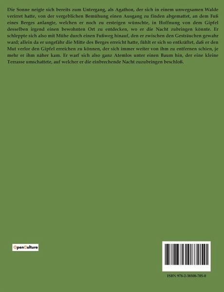 Die Sonne neigte sich bereits zum Untergang, als Agathon, der sich in einem unwegsamen Walde verirret hatte, von der vergeblichen Bemühung einen Ausgang zu finden abgemattet, an dem Fuß eines Berges anlangte, welchen er noch zu ersteigen wünschte, in Hoffnung von dem Gipfel desselben irgend einen bewohnten Ort zu entdecken, wo er die Nacht zubringen könnte. Er schleppte sich also mit Mühe durch einen Fußweg hinauf, den er zwischen den Gesträuchen gewahr ward; allein da er ungefähr die Mitte des Berges erreicht hatte, fühlt er sich so entkräftet, daß er den Mut verlor den Gipfel erreichen zu können, der sich immer weiter von ihm zu entfernen schien, je mehr er ihm näher kam. Er warf sich also ganz Atemlos unter einen Baum hin, der eine kleine Terrasse umschattete, auf welcher er die einbrechende Nacht zuzubringen beschloß.