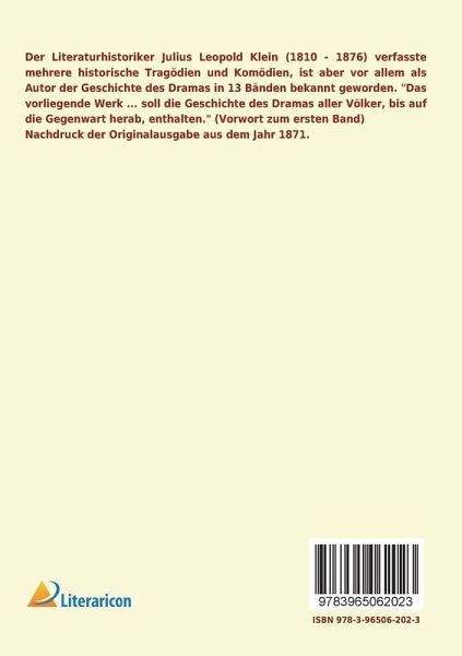Der Literaturhistoriker Julius Leopold Klein (1810 - 1876) verfasste mehrere historische Tragödien und Komödien, ist aber vor allem als Autor der Geschichte des Dramas in 13 Bänden bekannt geworden. "Das vorliegende Werk ... soll die Geschichte des Dramas aller Völker, bis auf die Gegenwart herab, enthalten." (Vorwort zum ersten Band)