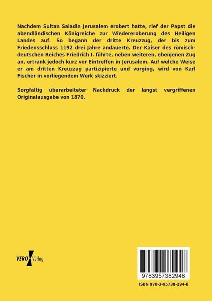 Nachdem Sultan Saladin Jerusalem erobert hatte, rief der Papst die abendländischen Königreiche zur Wiedereroberung des Heiligen Landes auf. So begann der dritte Kreuzzug, der bis zum Friedensschluss 1192 drei Jahre andauerte. Der Kaiser des römisch- deutschen Reiches Friedrich I. führte, neben weiteren, ebenjenen Zug an, ertrank jedoch kurz vor Eintreffen in Jerusalem. Auf welche Weise er am dritten Kreuzzug partizipierte und vorging, wird von Karl Fischer in vorliegendem Werk skizziert.
