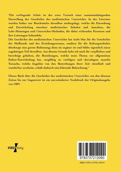 Dieses Buch über die Geschichte des medizinischen Unterrichts von den ältesten Zeiten bis zur Gegenwart ist ein unveränderter Nachdruck der Originalausgabe von 1889.