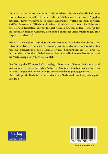 Eduard L. Wedekind schildert im vorliegenden Band die Geschichte des Johanniter-Ordens von seiner Gründung im 12. Jahrhundert in Jerusalem bis hin zur Entwicklung des Heermeistertums Sonnenburg im 15. und 16. Jahrhundert in Preußen. Dabei werden besonders die inneren Strukturen und die Verfassung des Ordens beleuchtet.