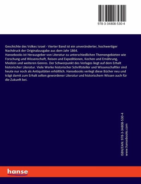 Geschichte des Volkes Israel - Vierter Band ist ein unveränderter, hochwertiger Nachdruck der Originalausgabe aus dem Jahr 1864.Hansebooks ist Herausgeber von Literatur zu unterschiedlichen Themengebieten wie Forschung und Wissenschaft, Reisen und Expeditionen, Kochen und Ernährung, Medizin und weiteren Genres. Der Schwerpunkt des Verlages liegt auf dem Erhalt historischer Literatur. Viele Werke historischer Schriftsteller und Wissenschaftler sind heute nur noch als Antiquitäten erhältlich. Hansebooks verlegt diese Bücher neu und trägt damit zum Erhalt selten gewordener Literatur und historischem Wissen auch für die Zukunft bei.