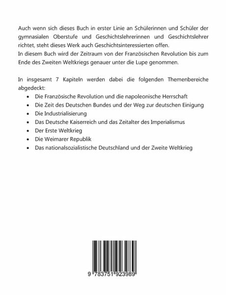 Dieses Buch richtet sich in erster Linie an Schülerinnen und Schüler der gymnasialen Oberstufe und Geschichtslehrerinnen und Geschichtslehrer, steht aber natürlich auch allen anderen Geschichtsinteressierten offen, die sich für die Zeit von der Französischen Revolution bis zum Ende des Zweiten Weltkriegs interessieren.In diesem Buch wird nämlich genau jener Zeitraum näher unter die Lupe genommen.In insgesamt 7 Kapiteln werden dabei die folgenden Themenbereiche abgedeckt:- Die Französische Revolution und die napoleonische Herrschaft- Die Zeit des Deutschen Bundes und der Weg zur deutschen Einigung- Die Industrialisierung- Das Deutsche Kaiserreich und das Zeitalter des Imperialismus- Der Erste Weltkrieg- Die Weimarer Republik- Das nationalsozialistische Deutschland und der Zweite Weltkrieg