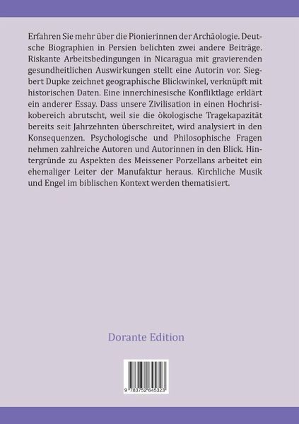 Erfahren Sie mehr über die Pionierinnen der Archäologie. Deutsche Biographien in Persien belichten zwei andere Beiträge. Riskante Arbeitsbedingungen in Nicaragua mit gravierenden gesundheitlichen Auswirkungen stellt eine Autorin vor. Siegbert Dupke zeichnet geographische Blickwinkel, verknüpft mit historischen Daten. Eine innerchinesische Konfliktlage erklärt ein anderer Essay. Dass unsere Zivilisation in einen Hochrisikobereich abrutscht, weil sie die ökologische Tragekapazität bereits seit Jahrzehnten überschreitet, wird analysiert in den Konsequenzen. Psychologische und Philosophische Fragen nehmen zahlreiche Autoren und Autorinnen in den Blick. Hintergründe zu Aspekten des Meissener Porzellans arbeitet ein ehemaliger Leiter der Manufaktur heraus. Kirchliche Musik und Engel im biblischen Kontext werden thematisiert.