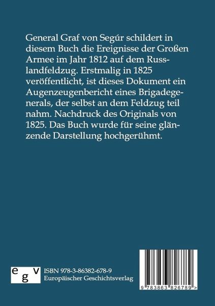 General Graf von Segúr schildert in diesem Buch die Ereignisse der Großen Armee im Jahr 1812 auf dem Russlandfeldzug. Erstmalig in 1825 veröffentlicht, ist dieses Dokument ein Augenzeugenbericht eines Brigadegenerals, der selbst an dem Feldzug teilnahm. Nachdruck des Originals von 1825.