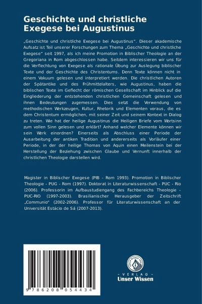 "Geschichte und christliche Exegese bei Augustinus". Dieser akademische Aufsatz ist Teil unserer Forschungen zum Thema "Geschichte und christliche Exegese" seit 1997, als ich meine Promotion in Biblischer Theologie an der Gregoriana in Rom abgeschlossen habe. Seitdem interessieren wir uns für die Verflechtung von Exegese als rationale Übung zur Auslegung biblischer Texte und der Geschichte des Christentums. Denn Texte können nicht in einem Vakuum gelesen und interpretiert werden. Die christlichen Autoren der Spätantike und des Frühmittelalters, wie Augustinus, haben die biblischen Texte im Geflecht der römischen Gesellschaft im Hinblick auf die Eingliederung der entstehenden christlichen Gemeinschaft gelesen und ihnen Bedeutungen zugemessen. Dies setzt die Verwendung von methodischen Werkzeugen, Kultur, Rhetorik und Elementen voraus, die es dem Christentum ermöglichen, mit seiner Zeit und seinem Kontext in Dialog zu treten. Wie hat der heilige Augustinus die Heiligen Briefe vom Wortsinn zum vollen Sinn gelesen und erklärt? Anhand welcher Elemente können wir sein Werk einordnen? Einerseits als Abschluss einer Periode der Ausarbeitung der antiken Tradition und andererseits als Vorläufer einer Periode, in der der heilige Thomas von Aquin einen Meilenstein bei der Herstellung der Beziehung zwischen Glaube und Vernunft innerhalb der christlichen Theologie darstellen wird.