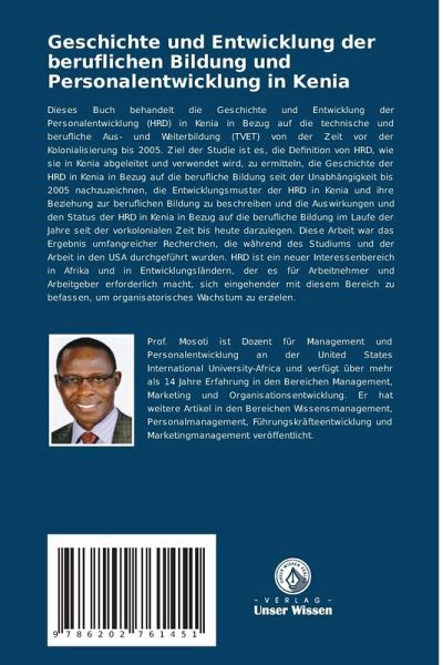 Dieses Buch behandelt die Geschichte und Entwicklung der Personalentwicklung (HRD) in Kenia in Bezug auf die technische und berufliche Aus- und Weiterbildung (TVET) von der Zeit vor der Kolonialisierung bis 2005. Ziel der Studie ist es, die Definition von HRD, wie sie in Kenia abgeleitet und verwendet wird, zu ermitteln, die Geschichte der HRD in Kenia in Bezug auf die berufliche Bildung seit der Unabhängigkeit bis 2005 nachzuzeichnen, die Entwicklungsmuster der HRD in Kenia und ihre Beziehung zur beruflichen Bildung zu beschreiben und die Auswirkungen und den Status der HRD in Kenia in Bezug auf die berufliche Bildung im Laufe der Jahre seit der vorkolonialen Zeit bis heute darzulegen. Diese Arbeit war das Ergebnis umfangreicher Recherchen, die während des Studiums und der Arbeit in den USA durchgeführt wurden. HRD ist ein neuer Interessenbereich in Afrika und in Entwicklungsländern, der es für Arbeitnehmer und Arbeitgeber erforderlich macht, sich eingehender mit diesem Bereich zu befassen, um organisatorisches Wachstum zu erzielen.