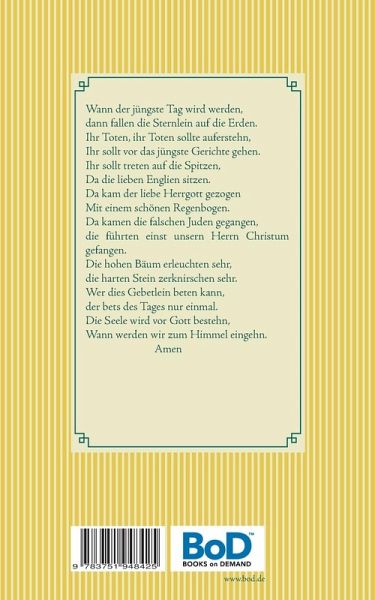 Wann der jüngste Tag wird werden,dann fallen die Sternlein auf die Erden.Ihr Toten, ihr Toten sollte auferstehn,Ihr sollt vor das jüngste Gerichte gehen.Ihr sollt treten auf die Spitzen,Da die lieben Englien sitzen.Da kam der liebe Herrgott gezogenMit einem schönen Regenbogen.Da kamen die falschen Juden gegangen,die führten einst unsern Herrn Christum gefangen.Die hohen Bäum erleuchten sehr, die harten Stein zerknirschen sehr.Wer dies Gebetlein beten kann,der bets des Tages nur einmal.Die Seele wird vor Gott bestehn,Wann werden wir zum Himmel eingehn.Amen