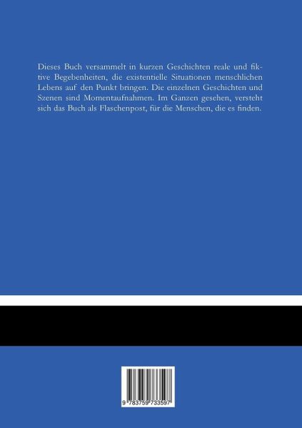 Dieses Buch versammelt in kurzen Geschichten reale und fiktive Begebenheiten, die existentielle Situationen menschlichen Lebens auf den Punkt bringen. Die einzelnen Geschichten und Szenen sind Momentaufnahmen. Im Ganzen gesehen, versteht sich das Buch als eine Flaschenpost für die Menschen, die es finden.
