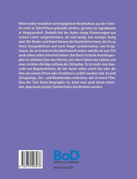 Wenn bisher mündlich weitergegebene Geschichten aus der Familie nicht in Schriftform gebracht werden, geraten sie irgendwann in Vergessenheit. Deshalb hat der Autor einige Erinnerungen aus seinem Leben aufgeschrieben, die mal lustig, mal weniger lustig sind. Die Kinder und Enkel können die Geschichten lesen, die bis zu ihren Ururgroßeltern und noch länger zurückreichen, von Ereignissen, die so in keinem Geschichtsbuch stehen und die sie zum Teil auch schon selbst miterlebt haben. Das Buch ist keine Autobiographie im üblichen Sinn des Wortes, mit allen Fakten des Lebens und einer strikten Abfolge entlang der Zeitachse. Es ist mehr eine Auswahl von Begebenheiten, die der Autor selbst erlebt hat oder die ihm von seinen Eltern oder Großeltern erzählt worden sind. Es sind Zeitsprünge, Vor- und Rückblenden enthalten, wie in einem Film. Dass der Text keine Biographie ist, kann man auch daran erkennen, dass wenig private Sachverhalte beschrieben werden.