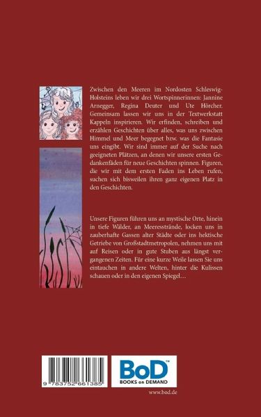 Drei Autorinnen, die ihre Schreibfedern ungern je aus der Hand legen und alles zu Texten verarbeiten, was die Fantasie beflügelt, haben Ideen und Gedanken aus verschiedensten Themenbereichen zu diesem Kurzgeschichten-Band verwebt. Die drei Wortspinnerinnen leben im Nordosten Schleswig-Holsteins, zwischen den Meeren, an der Schlei. Die Texte sind inspiriert durch die Textwerkstatt Kappeln entstanden.Damit hören die Gemeinsamkeiten schon auf: Das vorliegende Buch umfasst sozialkritische, fantastische und satirische Erzählungen ebenso wie Texte mit Landschaftsbeschreibungen, experimentelle Texte und einen Krimi.Die Figuren in den Geschichten führen uns an mystische Orte, hinein in tiefe Wälder, an Meeresstrände, locken uns in zauberhafte Gassen alter Städte oder ins hektische Getriebe von Großstadtmetropolen, nehmen uns mit auf Bahnhöfe und auf Reisen oder in gute Stuben aus längst vergangenen Zeiten. Für eine kurze Weile lassen Sie uns eintauchen in andere Welten, hinter die Kulissen schauen oder in den eigenen Spiegel.