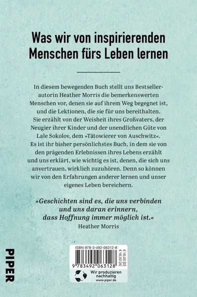 In diesem inspirierenden Handbuch für das Leben präsentiert Heather Morris die Geschichten der bemerkenswerten Menschen, denen sie auf ihrem Weg begegnet ist, und die Lektionen, die sie für uns bereithalten. Sie erzählt von der Weisheit ihres Großvaters, der Neugier ihrer Kinder und der unendlichen Güte von Lale Sokolov, dem »Tätowierer von Auschwitz«. Es ist ihr bisher persönlichstes Buch, in dem sie von den prägenden Erlebnissen ihres Lebens erzählt, und wie sie gelernt hat, denen, die sich ihr anvertrauen, wirklich zuzuhören - eine Fähigkeit, die wir ihrer Meinung nach alle lernen können. Hinweis: Dieser Artikel kann nur an eine deutsche Lieferadresse ausgeliefert werden.