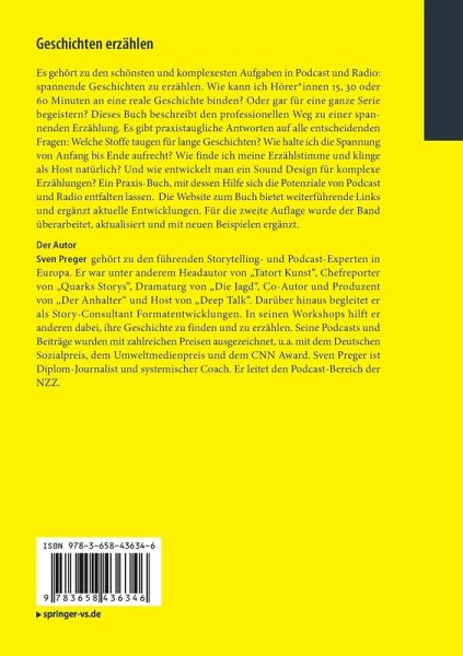 Es gehört zu den schönsten und komplexesten Aufgaben in Podcast und Radio: spannende Geschichten zu erzählen. Wie kann ich Hörer_innen 15, 30 oder 60 Minuten an eine reale Geschichte binden? Oder gar für eine ganze Serie begeistern? Dieses Buch beschreibt den professionellen Weg zu einer spannenden Erzählung. Es gibt praxistaugliche Antworten auf alle entscheidenden Fragen: Welche Stoffe taugen für lange Geschichten? Wie halte ich die Spannung von Anfang bis Ende aufrecht? Wie finde ich meine Erzählstimme und klinge als Host natürlich? Und wie entwickelt man ein Sound Design für komplexe Erzählungen? Ein Praxis-Buch, mit dessen Hilfe sich die Potenziale von Podcast und Radio entfalten lassen. Die Website zum Buch bietet weiterführende Links und ergänzt aktuelle Entwicklungen. Für die zweite Auflage wurde der Band überarbeitet, aktualisiert und mit neuen Beispielen ergänzt.