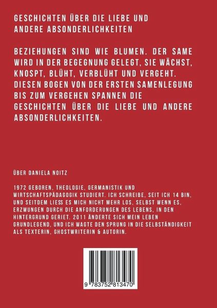 Beziehungen sind wie Blumen. Der Same wird in der Begegnung gelegt, sie wächst, knospt, blüht, verblüht und vergeht. Diesen Bogen von der ersten Samenlegung bis zum Vergehen spannen die Geschichten über die Liebe und andere Absonderlichkeiten.
