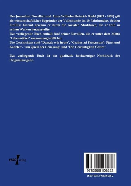 Der Journalist, Novellist und Autor Wilhelm Heinrich Riehl (1823 - 1897) gilt als wissenschaftlicher Begründer der Volkskunde im 19. Jahrhundert. Seinen Einfluss hierauf gewann er durch die sozialen Strukturen, die er früh in seinen Werken herausstellte. Das vorliegende Buch enthält fünf seiner Novellen, die er unter dem Motto \"Lebensrätsel\" zusammengestellt hat. Die Geschichten sind \"Damals wie heute\", \"Gradus ad Parnassum\", Fürst und Kanzler\", \"Am Quell der Genesung\" und \"Die Gerechtigkeit Gottes\". Das vorliegende Buch ist ein qualitativ hochwertiger Nachdruck der Originalausgabe.