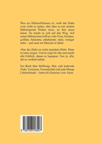 Was ein Hühnerfrikassee ist, weiß das Huhn zwar nicht so genau, aber dass es aus seinem Hühnergarten fliehen muss, ist ihm umso klarer. So macht es sich auf den Weg. Auf seiner Hühnerreise trifft es viele Tiere, kleinere, größere, bekannte, unbekannte, nette, weniger nette - und auch ein Mensch ist dabei.Aber das Huhn ist nicht irgendein Huhn. Denn es kann singen. Und es singt für alle und macht alle fröhlich, denen es begegnet. Nun ja, alle, die es verdient haben.Ein Buch über Hoffnung, Mut, sich ändernde Ziele, Vertrauen, Freundschaft und jede Menge Lebensfreude - liebevoll illustriert vom Autor.