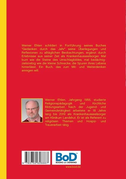 Werner Ehlen schildert in Fortführung seines Buches "Gedanken durch das Jahr" seine Überlegungen und Reflexionen zu alltäglichen Beobachtungen, ergänzt durch Erlebnisse aus seiner Zeit als Krankenhausseelsorger. Mal bunt wie die Steine des Umschlagbildes, mal bedächtig-zielstrebig wie die kleine Schnecke, die Spuren ihres Lebens hinterlässt. Ein Buch, das zum Mit- und Weiterdenken anregen will.