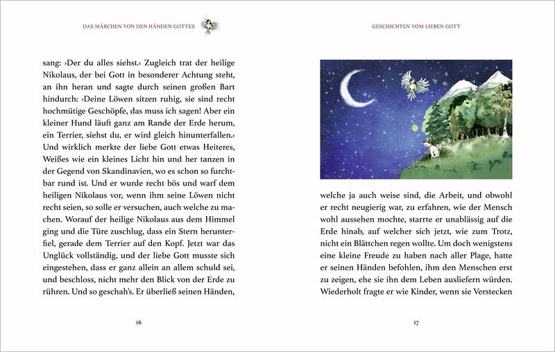 Was tun wohl gerade die Hände vom lieben Gott? Und könnte Gott sich vielleicht sogar in einem kleinen Fingerhut verstecken? In diesen heiter-ironischen und zugleich nachdenklich stimmenden Geschichten spürt Rainer Maria Rilke diesen und anderen Fragen nach. Inspiration für den großen Dichter lieferten ebenso die Geschichten der Bibel wie auch seine Reisen an die unterschiedlichsten Orte der Welt. Die hier ausgewählten, farbig illustrierten Episoden sind ein wahres Lesevergnügen.
