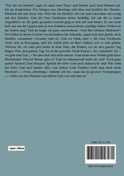 "Was für ein Herbst!« sagte sie nach einer Pause und blickte nach dem Himmel auf. Ich tat desgleichen. Der Morgen war allerdings sehr klar und köstlich für Oktober. Plötzlich fiel mir etwas ein: »Was für ein Herbst!« rief ich und schwenkte ein wenig mit den Händen. Und die Frau Nachbarin nickte beifällig. Ich sah ihr so einen Augenblick zu. Ihr gutes gesundes Gesicht ging so lieb auf und nieder. Es war recht hell, nur um die Lippen und an den Schläfen waren kleine schattige Falten. Woher sie das haben mag? Und da fragte ich ganz unversehens: »Und Ihre kleinen Mädchen?« Die Falten in ihrem Gesicht verschwanden eine Sekunde, zogen sich aber gleich, noch dunkler, zusammen. »Gesund sind sie, Gott sei Dank, aber «; die Frau Nachbarin setzte sich in Bewegung, und ich schritt jetzt an ihrer Linken, wie es sich gehört. »Wissen Sie, sie sind jetzt beide in dem Alter, die Kinder, wo sie den ganzen Tag fragen. Was, den ganzen Tag, bis in die gerechte Nacht hinein.« »Ja,« murmelte ich, ¿ »es gibt eine Zeit ...« Sie aber ließ sich nicht stören: »Und nicht etwa: Wohin geht diese Pferdebahn? Wieviel Sterne gibt es? Und ist zehntausend mehr als viel? Noch ganz andere Sachen! Zum Beispiel: Spricht der liebe Gott auch chinesisch? und: Wie sieht der liebe Gott aus? Immer alles vom lieben Gott! Darüber weiß man doch nicht Bescheid ¿.« »Nein, allerdings,« stimmte ich bei, »man hat da gewisse Vermutungen ...« »Oder von den Händen vom lieben Gott, was soll man da "
