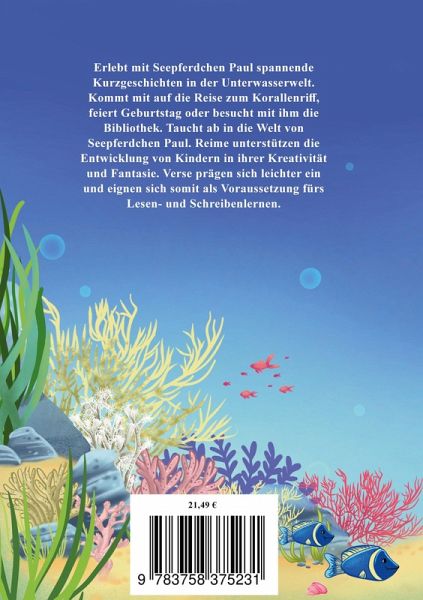 Erlebt mit Seepferdchen Paul spannende Kurzgeschichten in der Unterwasserwelt.Kommt mit auf die Reise zum Korallenriff,feiert Geburtstag oder besucht mit ihm dieBibliothek. Taucht ab in die Welt vonSeepferdchen Paul. Reime unterstützen dieEntwicklung von Kindern in ihrer Kreativitätund Fantasie. Verse prägen sich leichter einund eignen sich somit als Voraussetzung fürsLesen- und Schreibenlernen.