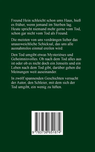 Freund Hein schleicht schon ums Haus, hieß es früher, wenn jemand im Sterben lag. Heute spricht niemand mehr gerne vom Tod, schon gar nicht vom Tod als Freund. Die meisten von uns verdrängen lieber das unausweichliche Schicksal, das uns alle ausnahmslos einmal ereilen wird. Den Tod umgibt etwas Mysteriöses und Geheimnisvolles. Ob nach dem Tod alles aus ist oder ob es nicht doch ein Jenseits und ein Leben nach dem Tod gibt, darüber gehen die Meinungen weit auseinander. In zwölf spannenden Geschichten versucht der Autor, den Schleier, mit dem sich der Tod umgibt, ein wenig zu lüften.
