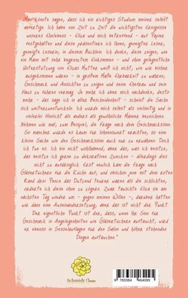 Barry Pains humoristischer Roman über ein Ehepaar wurde erstmals 1921 veröffentlicht und erst 2015 mit der Übersetzerin Melanie Schmidt erstmalig ins Deutsche übertragen und als gebundene Ausgabe herausgebracht. Nun wurde es überarbeitet als Taschenbuch veröffentlicht, um es im Buch mit mehr Farbe und im Cover mit mehr Witz und Charme für neue Leser zu versehen.Pains Roman erzählt auf witzige Weise vom Eheleben Elizas mit ihrem Gatten und die deutsche Übersetzung behält originell die alte gewählte Sprache von 1921 bei:"Man könnte sagen, dass ich ein richtiges Studium meiner selbst anfertige. Ich habe von Zeit zu Zeit die wichtigsten Ereignisse unseres Ehelebens - Eliza und mich betreffend - auf Papier festgehalten und diese präsentiere ich Ihnen, geneigter Leser, geneigte Leserin, in diesem Büchlein. Ich denke, diese zeigen, wie ein Mann mit sehr begrenztem Einkommen - und ohne gelegentliche Unterstützung von Elizas Mutter weiß ich nicht, wie wir bisher ausgekommen wären - in großem Maße Ehrbarkeit zu wahren, Geschmack und Ansichten zu zeigen und seine Ehefrau und sein Haus zu führen vermag. Je mehr ich über mich nachdenke, desto mehr - das sage ich in aller Bescheidenheit - scheint die Sache sich weiterzuentwickeln. Ich würde mich selbst als vielseitig und in vielerlei Hinsicht als anders als gewöhnliche Männer bezeichnen. Nehmen wir mal, zum Beispiel, die Frage nach dem Geschmackssinn. So mancher würde es kaum für lohnenswert erachten, so eine kleine Sache wie den Geschmackssinn auch nur zu erwähnen: Doch ich tue es. Ich bin nicht wohlhabend, aber das, was ich besitze, das besitze ich gerne zu dekorativen Zwecken - allerdings dies nicht zu aufdringlich. Erst neulich kam die Frage nach Gläsertüchern für die Küche auf, und obschon jene mit dem roten Rand drei Pence das Dutzend teurer waren als die schlichten, orderte ich diese ohne zu zögern. Zwar tauschte Eliza sie am nächsten Tag wieder um - gegen meinen Willen -, darüber hatten wir dann eine Auseinandersetzung, aber das ist nicht der Punkt. Der eigentliche Punkt ist der, dass, wenn Ihr Sinn für Geschmack in Angelegenheiten wie Gläsertüchern auftaucht, wird er ebenso in Sesselauflagen für den Salon und höher stehenden Dingen auftauchen."