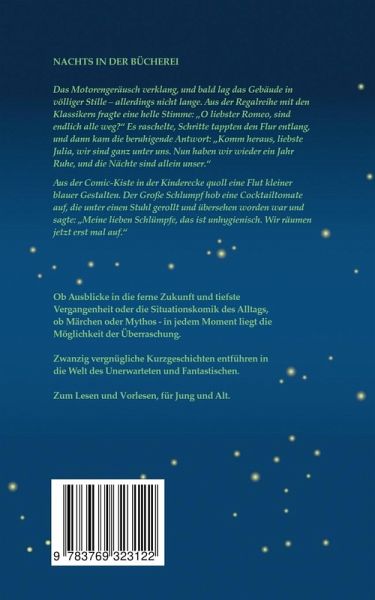 Zwanzig Geschichten, ein wenig abseits der Realität und querbeet durch verschiedene Genres, laden zum Schmunzeln ein. Ob Ausblicke in die ferne Zukunft, die tiefste Vergangenheit oder die Situationskomik des Alltags, ob Märchen oder Mythos, in jedem Moment liegt die Möglichkeit der Überraschung. Auf Forschungsmission im Weltall, im Zwiegespräch mit frustriertem Küchengerät, zu Gast bei einer ganz außergewöhnlichen Köchin. Und natürlich ... nachts in der Bücherei, in Gesellschaft literarischer Gestalten. Dazu noch viel, viel mehr. Zwanzig vergnügliche Kurzgeschichten für Jung und Alt, besonders gut zum Vorlesen geeignet.