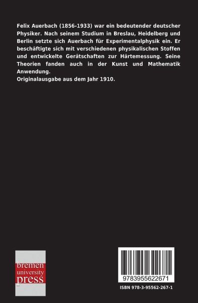 Felix Auerbach (1856-1933) war ein bedeutender deutscher Physiker. Nach seinem Studium in Breslau, Heidelberg und Berlin setzte sich Auerbach für Experimentalphysik ein. Er beschäftigte sich mit verschiedenen physikalischen Stoffen und entwickelte Gerätschaften zur Härtemessung. Seine Theorien fanden auch in der Kunst und Mathematik Anwendung. Originalausgabe aus dem Jahr 1910.